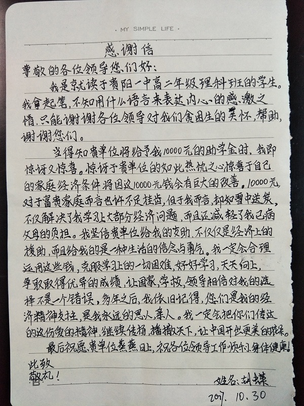 天柱县计生协专职副会长(左)为杨漫(右)发放助学金感谢信截图感谢信截图“下星期就要期末考试了,我一定会争取获得更好的成绩,过个好年,让妈妈与您放心”。这是天柱县二中高二学生杨漫给爱心...
