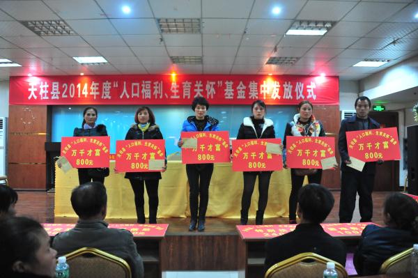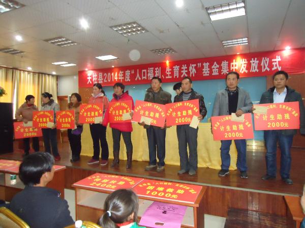 2014年12月25日,天柱县举行2014年度“人口福利.生育关怀基金”集中发放仪式,现场发放生育关怀基金共34.06万元,救助计生困难家庭205(人)户,(其中助学129人13.34万元,助残49户14.6万元,大病、自然灾害救助15户4.8万元,失独家庭特殊救助6人0.72万元,在押计生家庭子女困难救助6人0.6万元)。(文图:天柱县计生协熊齐书)