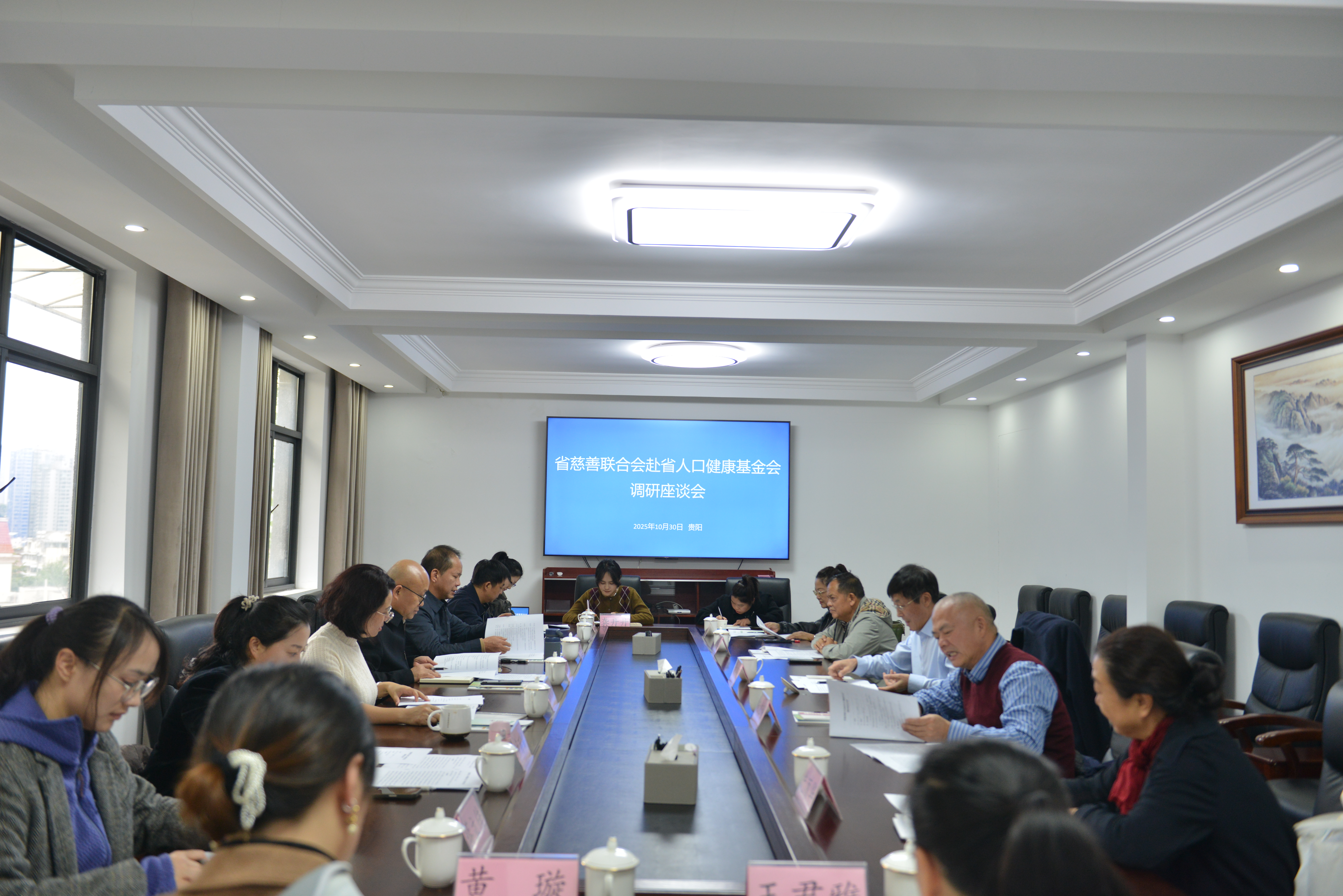 10月30日,省慈善联合会到省人口健康基金会调研座谈。省卫生健康委原一级巡视员、省慈善联合会社会(医疗)救助工作委员会主任委员皮宇
